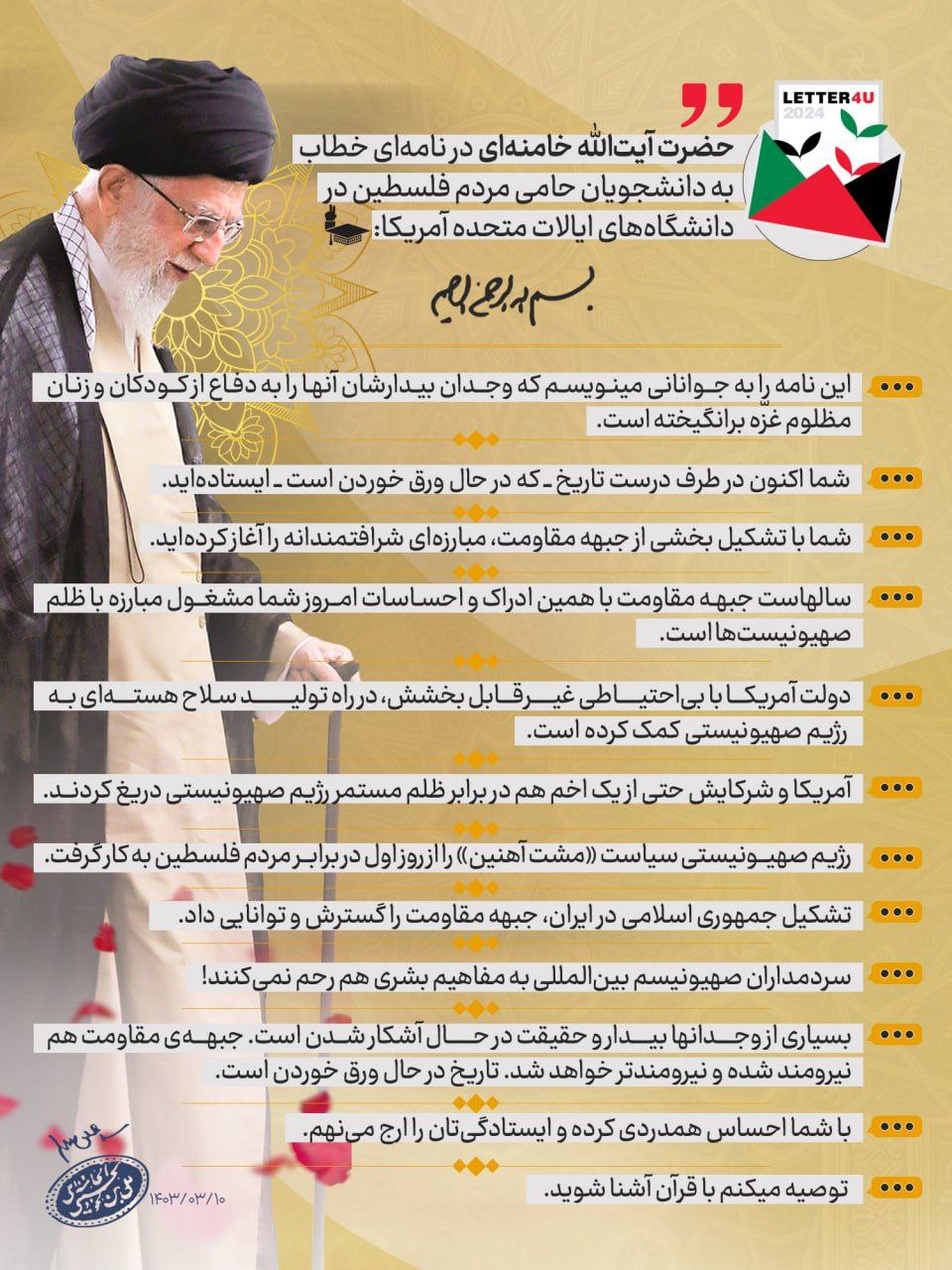 تصاویر گرافیکی وقایع ۱۳ خرداد ۱۴۰۳ نامه مقام معظم رهبری به دانشجویان معترض به جنایات رژیم صهیونیستی تصویر گزیدهای از نامه مقام معظم رهبری به دانشجویان معترض به جنایات رژیم صهیونیستی در دانشگاههای امریکا: متن کامل نامه: دانشجویان آمریکا رژیم صهیونیستی فلسطین نامه نامه رهبری